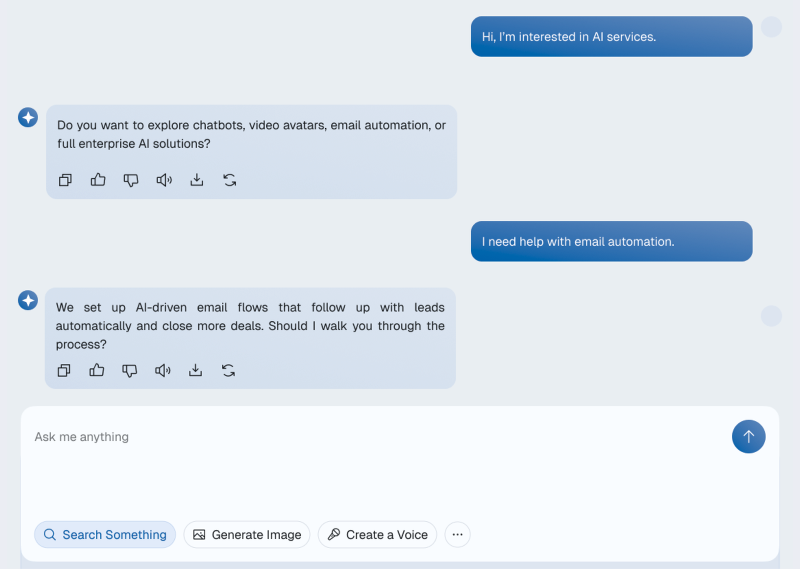 From first contact to lasting customer relationships, our AI solutions give your business the edge it needs. Whether it’s engaging chatbots, realistic avatars, or workflow automation, we bring technology and strategy together to drive measurable results.
